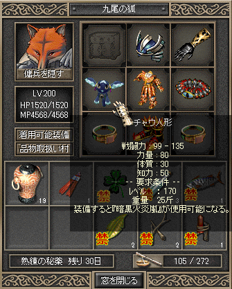 装備する事の出来ない物を装備させたいキャラ(例として九尾の狐)にチャウ人形を装備させたいのであれば、主人のアイテム枠にあるチャウ人形をクリックしてチャウ人形を動かせる様にします(装備からは外しておきます)。