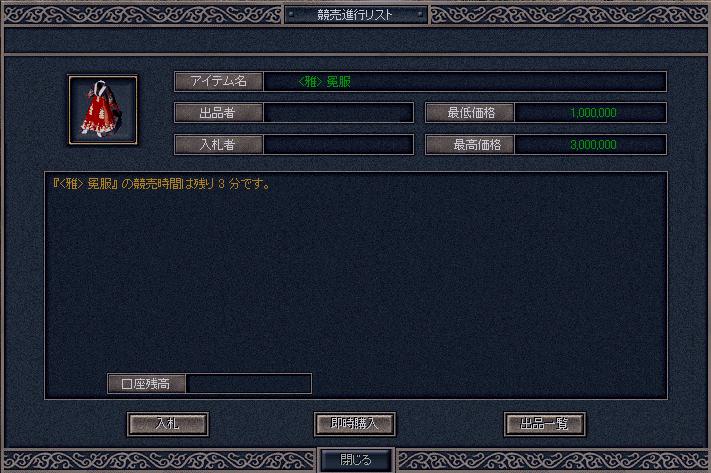 本日はインする事が出来、経験値稼ぎ!! 送られてきた伝書を見てみると4年程前からインする事がなくなった元団員さんから伝書があり、復帰したとの連絡が! 懐かしさと嬉しさ+大興奮しました一からのスタートだそうですが頑張って下さい! ~おまけ~ 競売を見ているとインパクト大の値段設定が 値段設定間違えでしょうか