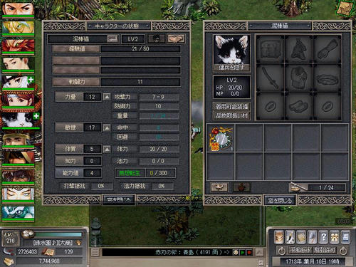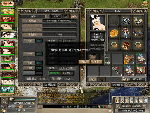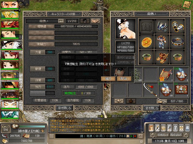 昨日、術使いがLv200になりました 中国へ帰化し、夢想無し幻術士との交代の時がやってきました。 その前に経験値転換!! 結果は術使いが天照靴、幻術士が天照帯、天照靴 夢想無し幻術士は夢想して術使いに戻しサブへ移動 その後、Lv200術使いを幻術士へ転業しました。 長い間お疲れ様でした そして空いた枠で泥棒猫を雇用 鳴き声が可愛いです 今いるメンバーで夢想可能なものは全て夢想を終えました。 憤怒羅漢と雷公のみLv200転業をしていないので踏ん切りがついたらチャンレンジしようと思います