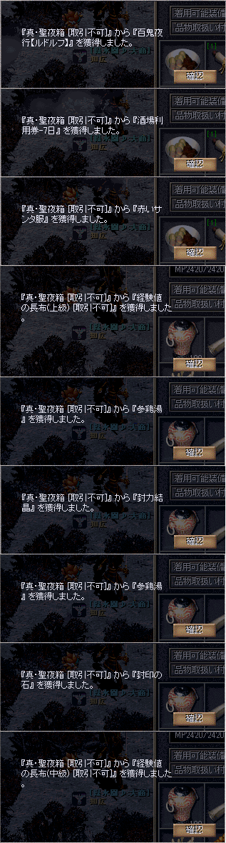 1つの箱に入っていた内容量です⇒百鬼夜行×1、酒場利用券×1、サンタ服×1、経験値(上級)×1、参鶏湯×10、封力結晶×5、封印の石×1、経験値(中級)×20、天下壮士×1