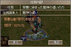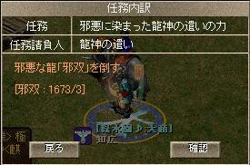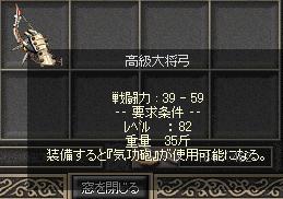 今回の収穫は以下の様になりました、 昨日と逆で甲の印が多く取れました 総合的に収穫は少なめです、しかしなかなか龍頭の杖が出ませんorz 4日目邪双撃破数です( ゚д゚) 息抜きにヒョンウテを狩っている際に古い大将弓をドロップしました、 クラッシャーの称号を持つ正宗に鍛えてもらいに… 高級化 初めて高級大将弓を手に入れる事が出来ました