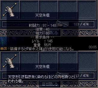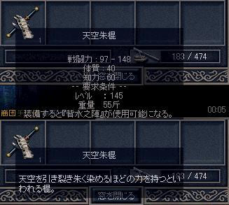 邪双と戦い始めて2~3戦目に… 棍が出ました 以下天空朱棍の詳細です↓ 取れるまでかなり時間が掛かりました 上のssは棍が出るまで邪双と戦った数となります、 棍が出て暫く戦闘していると…やっと! 出ました 本当に久しぶりの龍頭の杖ドロップでした、 今回のドロップ収集はとても満足出来ました 邪双討伐総合数を撮るのをまた忘れましたorz、9200体程倒していたかと思います、 もうすぐ1万体に到達しそうです、このままドロップ運が良い事を願うばかりです