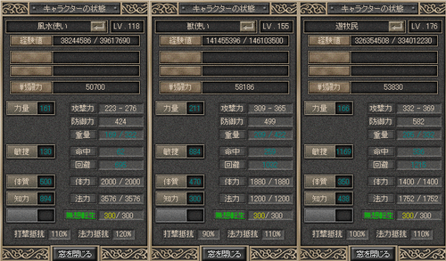 氷龍狩りは休憩し鳳凰狩石を装備したいが為に吉祥をLv155まで上げました、 Lv141→Lv155まで結構な時間が掛かりました、1日で上げるにはかなり厳しいものがあります、久しぶりに熱を入れて狩りをした気分です これまでの成長は以下の様になりました、 明日からまた忠臣の強化を進めたいと思います ~おまけ~ 小切手の数がものすごいです…