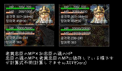 対空最強、対地では戦騎将一足を引っ張る!(独断です)忠臣ですが、忠臣の技の一つである忠臣の魂(以下分身と省略)のHP,MPは忠臣のMPに依存している様です、