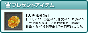 八つの印を集めるともらえる様です、日にち制限が記載されていないので期待してます!もし術装備品なら生産品の札が…orz