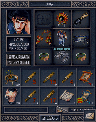 これまでの収穫は↓ 兜 9 → 11(+3) 鎧 11 → 13(+2) 小手 12 → 18(+6) 指輪 9 → 14(+5) 靴 8 → 14(+6) 黄玉 7 → 15(+8) 皮袋 11 → 14(+3) 上記の材料が50~100程たまるまでやってみようと思います 回春堂イベント 6/6 プサン 済 6/7はソギポ! ~おまけ~ 以前にもあったバグがまた出ました、 吉祥の装備、道具が主人に…