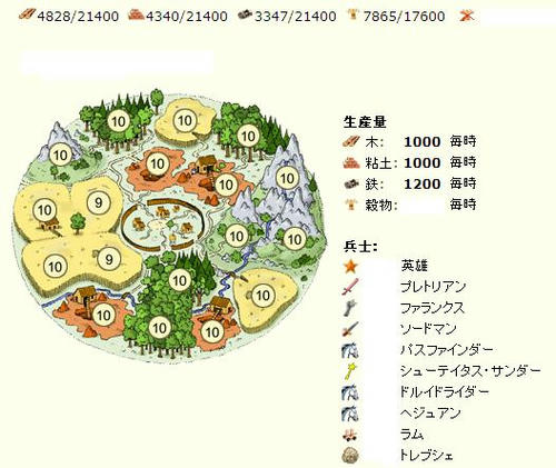 製粉所Lv5 穀倉Lv12 馬舎Lv10 倉庫Lv13 防具工場Lv5 学院Lv15