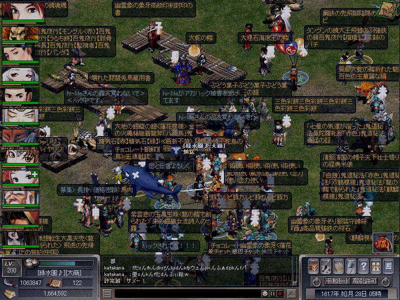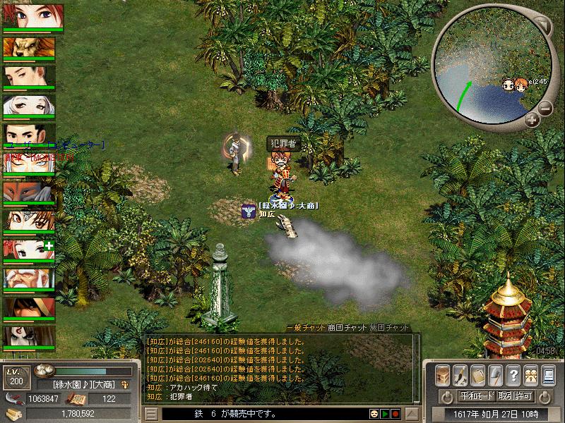 追跡してみると江戸→南京→朝嶺→南京→台北→江戸→チュプベツ→ポロヌプ(投資金を抜く)→チュプベツ→江戸→競売所(主人が装備していた丁若庸の帽子をはずし床に置き去る)→江戸(文字化けのキャラと取引、文字化けは江戸の初心者訓練場に逃げる、hi-lite(アカハック犯)は江戸の村の中に逃げる数分して外に出てくる)→京→市街へ移動(IM品等の投売り)、